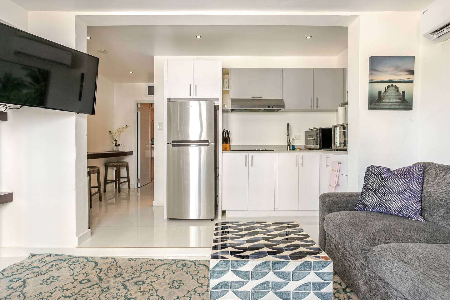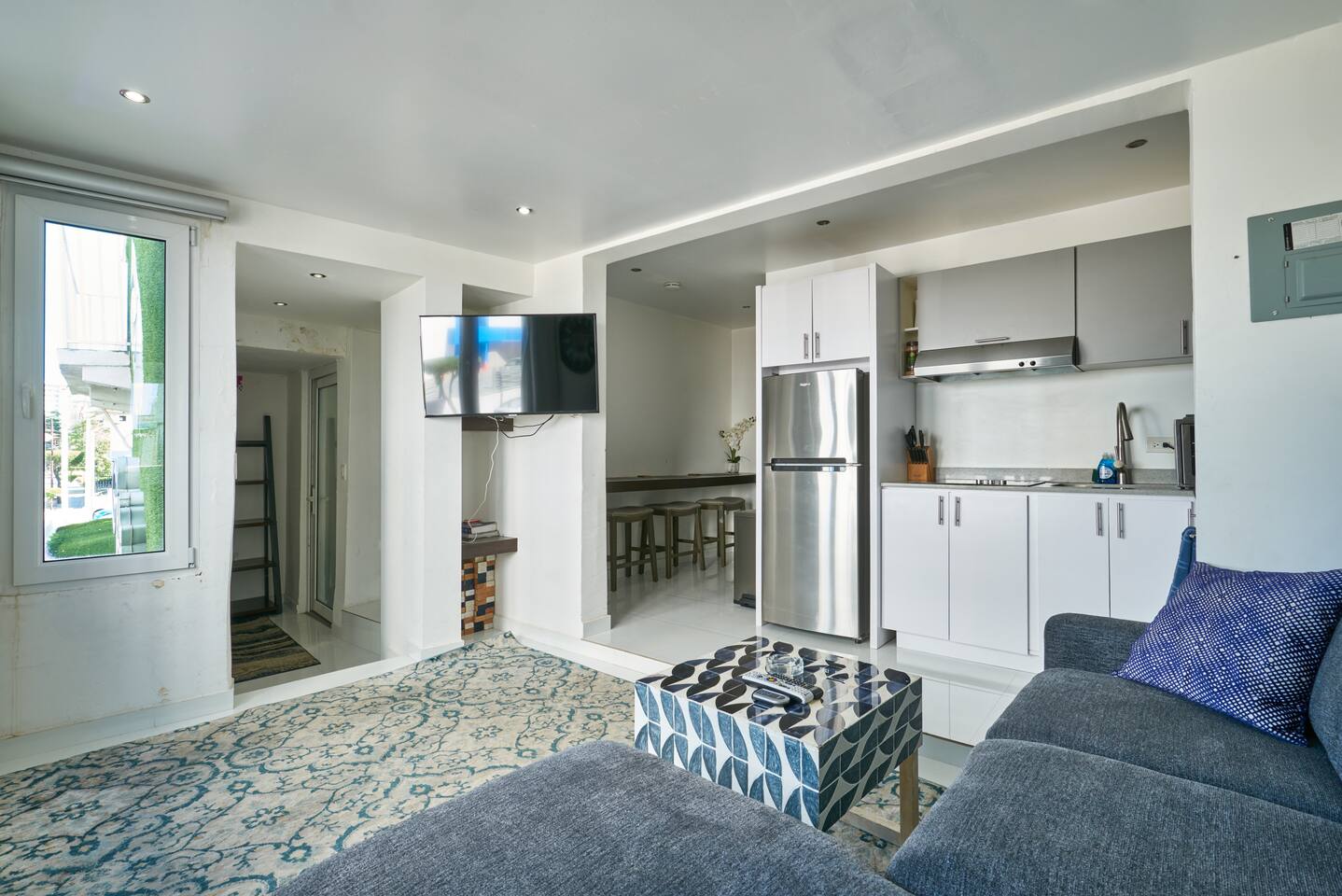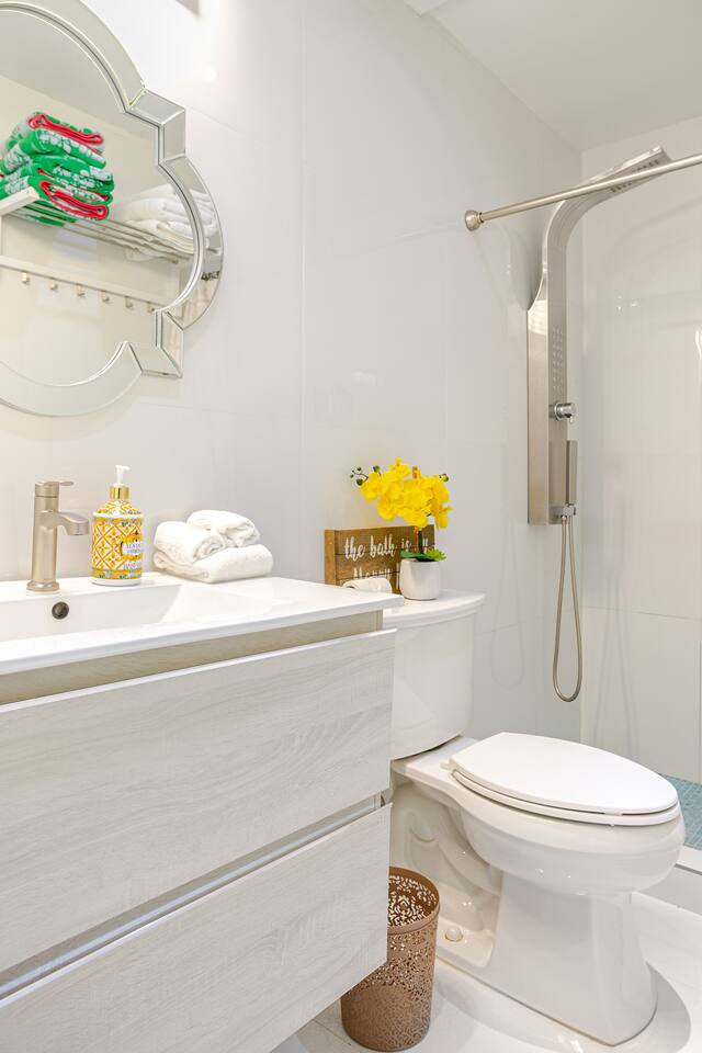 Step into the ❤️heart of our welcoming retreat, where indoor comfort and outdoor delight seamlessly converge. Within, you'll find a haven of relaxation, complete with an open living room and kitchen area designed for comfort. Sink into the plush leather L-shaped sofa, with some classic board games that promise hours of shared fun and laughter. Meanwhile, the well-equipped kitchen stands ready to assist in your culinary adventures, and a cozy breakfast bar-style seating area provides the perfect setting to savor your creations. And just beyond your doorstep lies a shared pool, a watery oasis that invites you to bask in the sun or take a refreshing dip. With every splash, you'll wash away the cares of the day and embrace pure relaxation. But that is not all, after enjoying the moments with your loved ones make your way to the master bedroom, fit with a glorious and comfortable king sized bed, promising a blissful nights sleep As you step outside, the enchanting location unfolds before you. Nestled in a vibrant neighborhood, our retreat is just moments away from the area's most enticing attractions. Pristine beaches, renowned hotels, casinos, and a wealth of shopping and dining options await your exploration. The conveniences of supermarkets and a pharmacy are close at hand, ensuring that your needs are met with ease. Additionally, a myriad of thrilling water sports, from paddle boarding to kayaking, beckon the adventurous. And when it's time to venture further, the historic charm of Old San Juan is a mere 10-minute drive away, while the airport is just 3 minutes from your door, ensuring a smooth journey to and from your unforgettable retreat. ✔ 5⭐️ Location ✔ Shared Pool ✔ King Bed ❖ LIVING ROOM ❖ Now, let's step into the inviting living room, seamlessly connected to the kitchen. A luxurious leather L-shaped sofa awaits, beckoning you to kick up your feet and share some precious moments with your loved ones. We've also got a collection of board games, perfect for some good old-fashioned fun and laughter. As you sink into the plush sofa, you'll feel the weight of the modern-day hustle and bustle melt away from your shoulders. It's a space designed for relaxation and rejuvenation, where worries seem to vanish into the cozy embrace of the sofa. What's more, you have a direct view of the wall-mounted HDTV. Whether you're whipping up a meal in the kitchen or lounging on the sofa, you can stay engaged with all the on-screen action, ensuring that every moment is filled with entertainment and togetherness. ✔ Comfortable Sofa ✔ HDTV ✔ Open Plan & Spacious ❖️ KITCHEN & DINING ❖ Make your way to the kitchen, where an open layout seamlessly merges with the living room and dining area. It's a roomy and inviting space that beckons you to whip up delightful meals using an array of modern appliances – the stove, microwave, refrigerator, freezer, toaster, and, of course, a trusty coffee maker for your daily caffeine fix. You'll discover a well-stocked pantry with all the spices and herbs needed to infuse your dishes with flavor and flair. As you craft your culinary creations, gather along the cozy breakfast bar-style seating for three, nestled just around the corner of the kitchen in a charming nook. It's the perfect spot to savor your meals with your loved ones! ✔ Microwave ✔ Stove ✔ Coffee Maker ✔ Refrigerator ✔ Sink - Hot & Cold Water ✔ Silverware ✔ Pots & Pans ✔ Garbage Disposal ✔ Breakfast Bar With Seating for 3 ❖️ BEDROOM ARRANGEMENTS ❖ Step into the 1st bedroom, the master bedroom, and let it welcome you with open arms. Here, a luxurious king-sized bed awaits, promising to cradle you in a cocoon of pure relaxation. The coastal accents on the walls transport you to seaside serenity, even as you unwind inland. With a spacious dresser, there's plenty of room for your clothes, ensuring convenience without compromise on comfort. In the 2nd bedroom, you'll find another cozy haven. A queen bunk bed beckons, offering respite for all after your adventurous days. An HDTV graces this room, ready to entertain you in the evening. Whether it's a movie night or catching up on your favorite YouTube channels, the choice is yours. And here's the cherry on top – you have full control over the apartment's A/C, promising you a night of pure, personalized comfort. ♛ Bedroom 1: King Sized Bed ♛ Bedroom 2: Queen Bunk Beds & HDTV The bedrooms are equipped with the following amenities ✔ Premium Pillows, Linens, and Sheets ✔ Comfortable Beds ✔ Natural Lighting ❖️ BATHROOMS ❖ Head to the modern and inviting bathroom, where you can refresh and rejuvenate with your own walk-in shower. The magic of this shower isn't just in its sleek design—it's a hydromassage wonder! Turn it on, and feel the gentle jets of water cascade over you, giving your tired muscles a soothing massage as you wash away the day's adventures in the local area. Shampoo, conditioner, and body wash are all there, waiting to pamper you, making sure you leave feeling not just clean, but truly refreshed and revitalized. ✔ Soft Towels ✔ Shower ✔ Modern Design ❖ SHARED POOL ❖ Dive into the shared 25-meter pool during your staymand let the cool waters embrace you. It's your perfect oasis, whether you're craving a quick, refreshing dip to wake up your senses or longing to glide through the water, stroke by stroke, as the sun begins to set. With poolside hours from 8 AM to 8 PM, you have the luxury of flexibility, ensuring you can enjoy this aquatic haven at your own pace, whenever you desire. ✔ Shared Pool