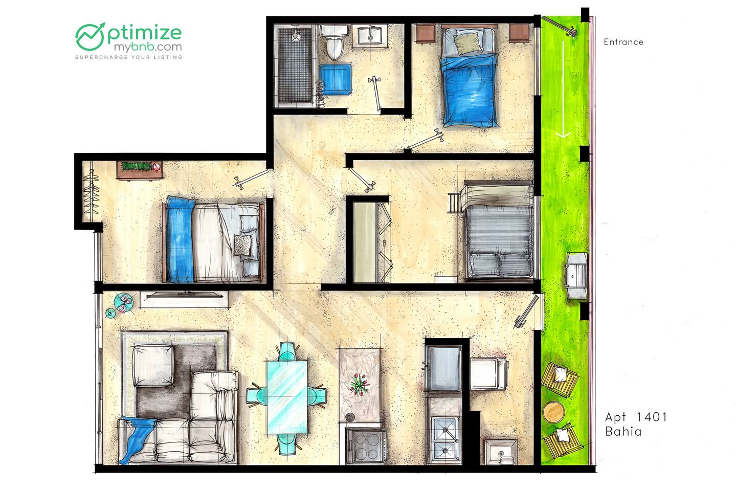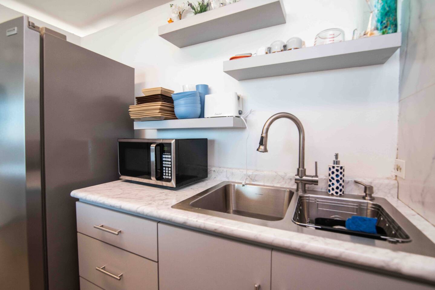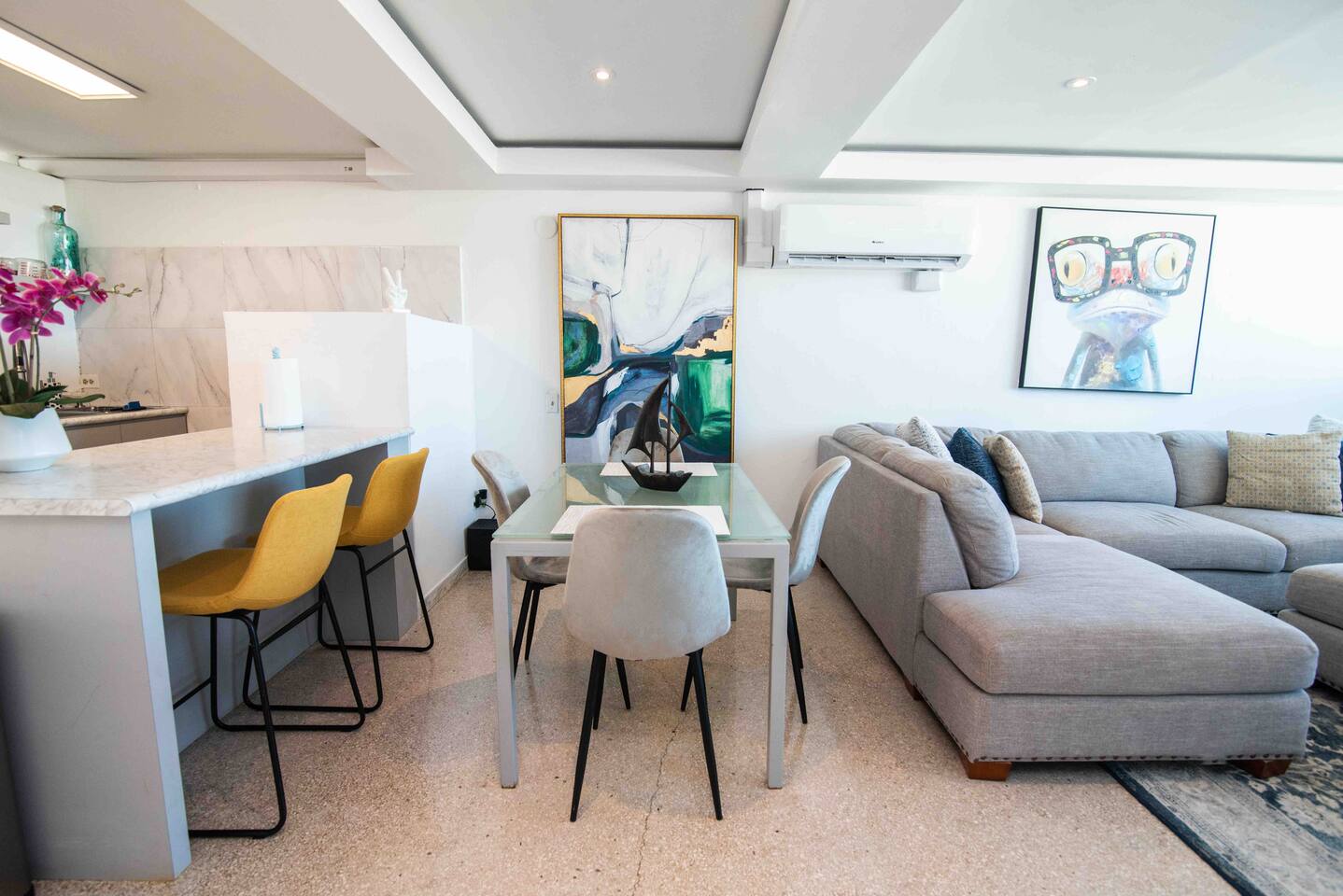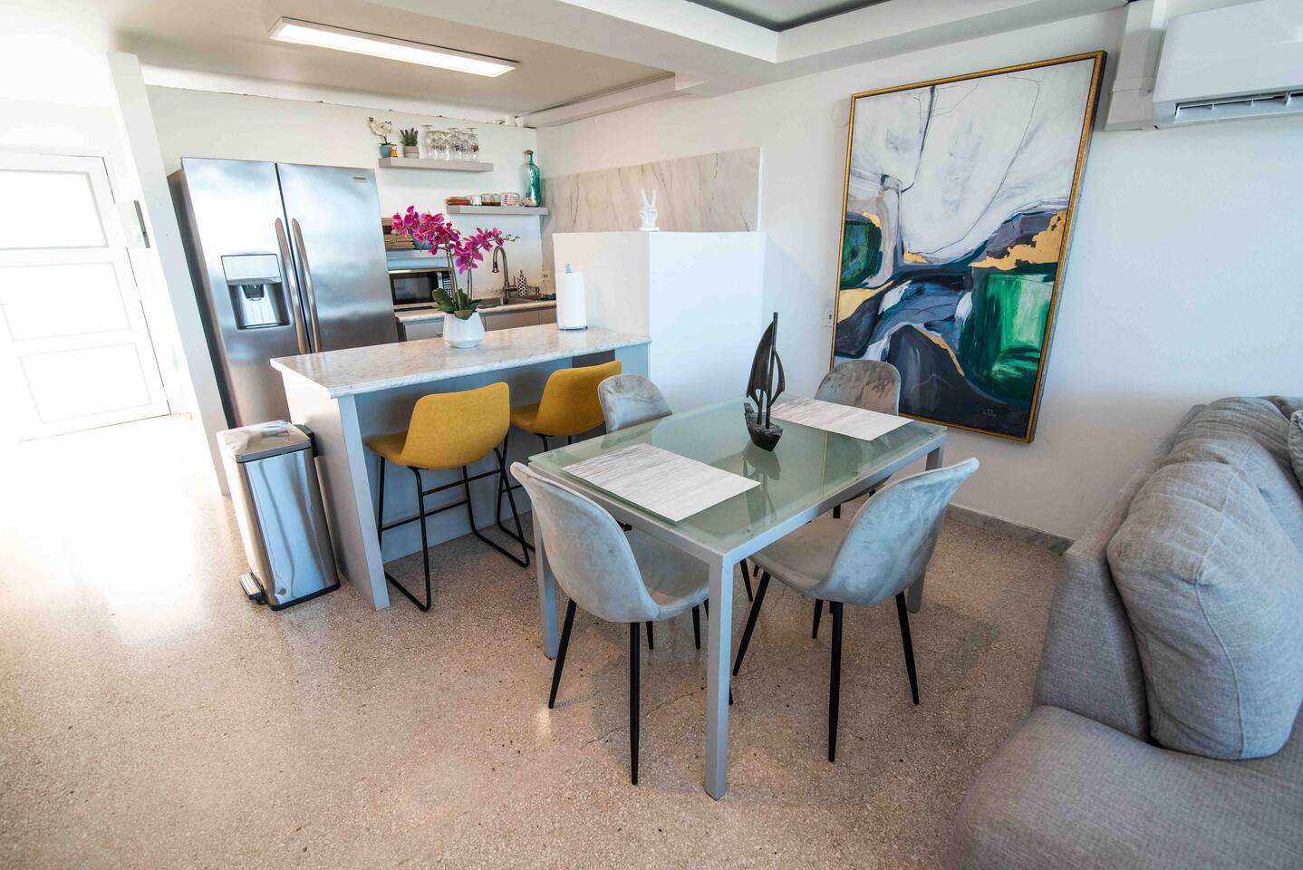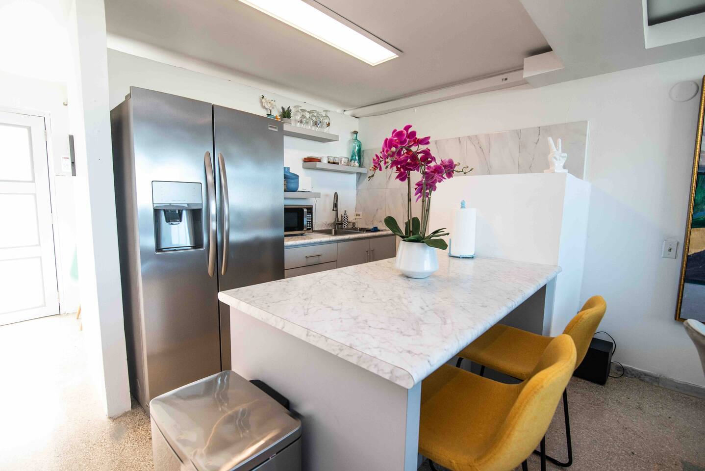 Welcome to the charming and modern abode with an open-concept living space flooded with natural light. The cozy living room features a generous L-shaped sofa, perfect for unwinding after beach escapades or a delectable meal at a local eatery. You can easily relax, kick your feet up, and enjoy some entertainment on the HDTV. And don't forget the view - through the window, you'll glimpse the bustling city skyline and the tranquil ocean beyond, an ever-changing canvas that becomes even more enchanting as the night falls, painting the city in a sea of lights. Nestled within the vibrant heart of San Juan, our Airbnb offers an unmatched experience, treating you to breathtaking vistas that stretch across the expansive Ocean, the picturesque San Juan Bay, and the dynamic cityscape of San Juan. Located in the bustling Urban Art District, you'll revel in the proximity to an array of conveniences, from local supermarkets to an eclectic selection of restaurants, lively bars, SuperWalmart, 24/7 Walgreens, cozy cafes, a bustling food truck park, inviting beaches, the trendy Condado area, and the historically rich old city of San Juan. ✔ Prime Location ✔ Private Balcony ✔ Modern ❖ LIVING ROOM ❖ Begin your journey in the inviting living room, where an open concept design welcomes an abundance of natural light. Sink into the plush embrace of the large L-shaped sofa, instantly feeling the warmth of home enveloping you. After a day of beach adventures or a delightful meal at one of the nearby restaurants, this living room becomes your haven. Take a seat, turn on the HDTV, and indulge in relaxation as you kick your feet up. As you glance out the window, you'll be treated to a captivating panorama of the city skyline views and coastal views. With the arrival of night, this view transforms into a mesmerizing spectacle, as the city comes alive with its twinkling lights, painting an even more beautiful picture outside your window. ✔ Comfortable Sofa ✔ HDTV ✔ Open Plan & Spacious ✔ City skyline views ✔ Coastal views ❖️ KITCHEN & DINING ❖ The kitchen beckons, fully equipped and ready for your culinary adventures. Whether you're in the mood for crafting a three-course gourmet masterpiece or simply whipping up a quick snack, everything you need is at your fingertips. And for all you coffee enthusiasts, a coffee maker awaits to brew that perfect cup. Now, let's talk about dining. Picture this: a charming breakfast bar with seating for two, ideal for those cozy morning meals. Alternatively, spread out your culinary creations on the dining table with enough room for four. After whipping up your delicious dishes in the kitchen, serve them up with ease, whether it's at the breakfast bar for a casual bite or the dining table for a hearty feast. ✔ Microwave ✔ Oven ✔ Cooker ✔ Wine Glasses ✔ Coffee Maker ✔ Refrigerator ✔ Dishwasher ✔ Freezer ✔ Sink - Hot & Cold Water ✔ Silverware ✔ Pots & Pans ✔ Garbage Disposal ✔ Indoor Dining Table With Seating for 4 ✔ Breakfast Bar Style Seating for 2 ❖️ BEDROOM ARRANGEMENTS ❖ As you enter the first bedroom, you'll find a cozy queen-sized bed, inviting you to snuggle in for a restful night. A gentle light above the bed bathes the room in a soft glow, ideal for those who enjoy a good read before drifting off into dreamland. Now, step into the second room, where another queen-sized bed awaits. Here, you'll discover a mirrored closet area, perfect for getting ready and ensuring you look your best. The room is bathed in natural light from the surrounding windows, creating a bright and airy atmosphere. Sink into the bed, and let the tranquility of the space lull you into a peaceful night's slumber. Welcome to the third bedroom, a cheerful space adorned with a bunk bed dressed in soft linens and comfortable mattresses. Designed with your kids in mind or just for fitting in everyone, this room promises a peaceful and restful night's sleep! ♛ Bedroom 1: Queen Sized Bed & Closet ♛ Bedroom 2: Queen Sized Bed & Closet ♛ Bedroom 3: BunkBed with 2 Full Sized Beds The bedrooms are equipped with the following amenities ✔ Premium Pillows, Linens, and Sheets ✔ Comfortable Beds with Casper Mattress ✔ Natural Lighting ❖️ BATHROOMS ❖ Ready to freshen up? Make your way to the bathroom and step into the walk-in shower. The water cascades down, washing away the weariness, leaving you feeling revitalized and ready for the day ahead. This bathroom is modern and well-lit, offering ample room for all your grooming essentials, so you can prep and pamper yourself in style. ✔ Soft Towels ✔ Shower ❖ PRIVATE BALCONY ❖ This charming apartment also has a special bonus with the private balcony, discovering a cozy corner of relaxation. Picture yourself sitting into the welcoming embrace of two cheerful yellow chairs. The endless ocean views stretch out far and wide, while the gentle breeze carries the soothing whispers of the sea. It's a serene addition to your stay! ✔ Outdoor Furniture Seating ✔ Private Balcony
