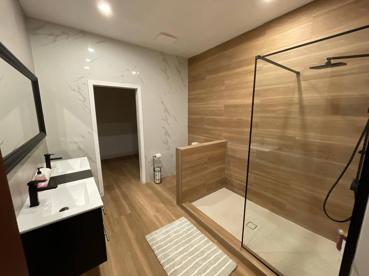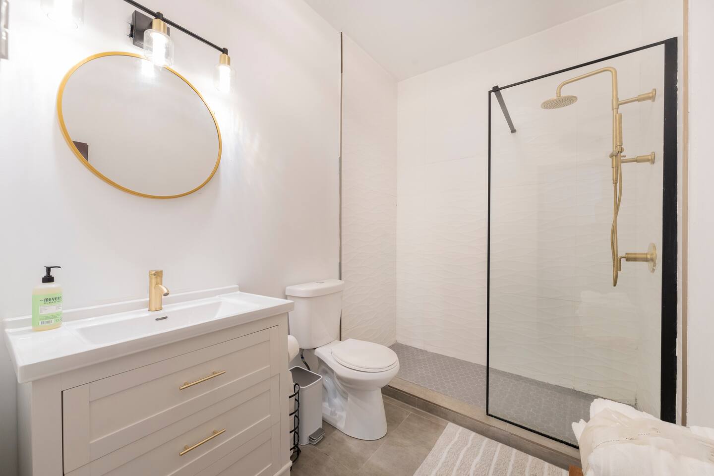 ❖️ BATHROOMS ❖ Time to refresh? Head into the first bathroom, ensuite to bedroom number two. This spacious, spa-like retreat invites you to unwind with its expansive walk-in shower, offering plenty of room for a luxurious experience. The modern vanity area, complete with his and hers sinks, ensures you and your loved one can get ready in style and efficiency. For a serene escape, step into the ensuite bathroom for bedroom number three. Adorned in a white and modern style with contrasting gold accents, this bathroom features a walk-in shower that promises to wash away the worries of the modern day hustle and bustle. ✔ Stylish & Sleek