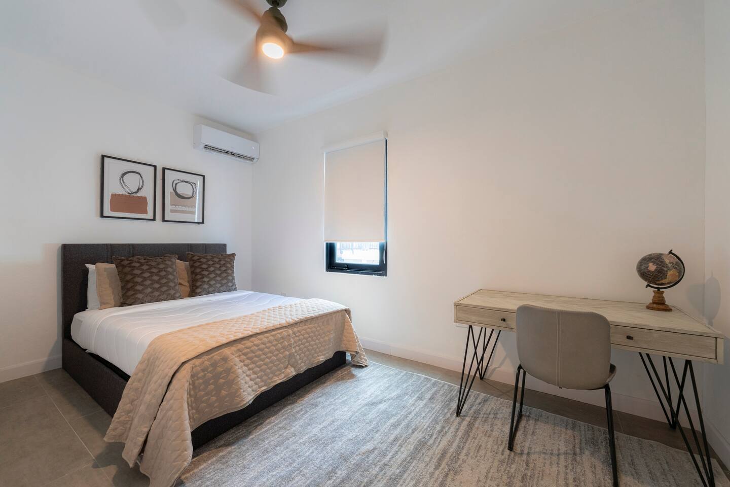 Step into your next spacious retreat, greeted with a sleek, modern interior where the fully equipped kitchen and open-concept living room blend seamlessly with the dining area at the center, creating the perfect spot to connect with loved ones. The three comfortable bedrooms ensure a restful stay, with the main bedroom featuring a king-sized bed, walk-in closet, personal ensuite, and a small private balcony. The second bedroom offers a cozy queen-sized bed and a dedicated workspace, while the third bedroom also has a queen-sized bed and its own working, office area. This home is designed for creating forever-lasting memories. Located in a prime area of San Juan, our retreat places you at the heart of the vibrant Santurce district. With beautiful beaches, iconic hotels, and lively casinos just minutes away, you’ll have endless opportunities for entertainment and relaxation. Nearby supermarkets, pharmacies, and water sports facilities add to the convenience, making this the perfect base for your Puerto Rican adventure. ✔ King Bed ✔ Private Balcony ✔ Modern & Stylish ✔ Prime Location ✔ Ensuite Bathrooms ✔ Dedicated Workspace