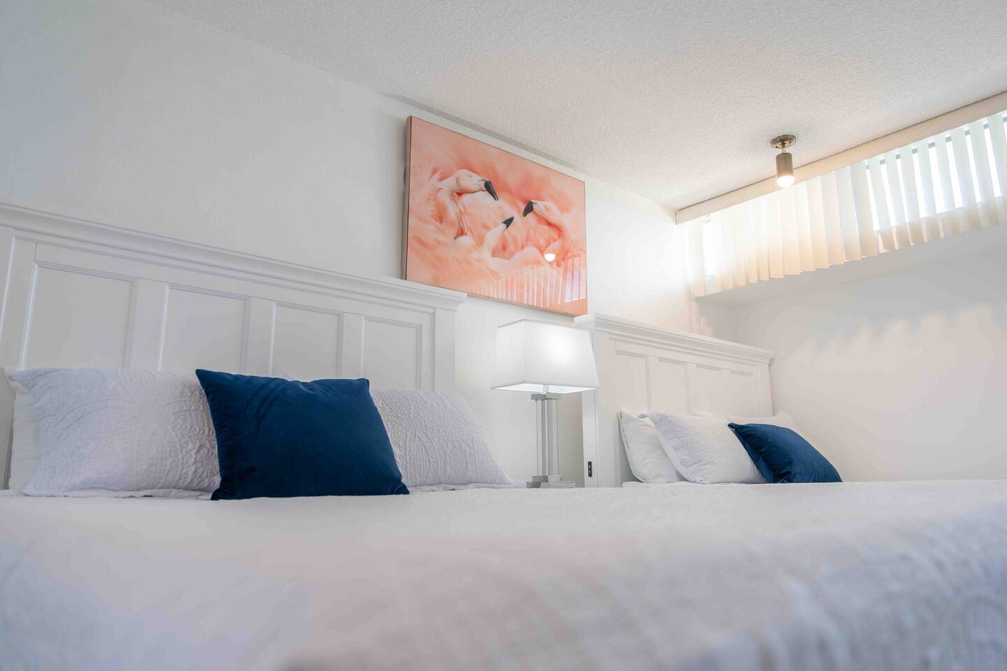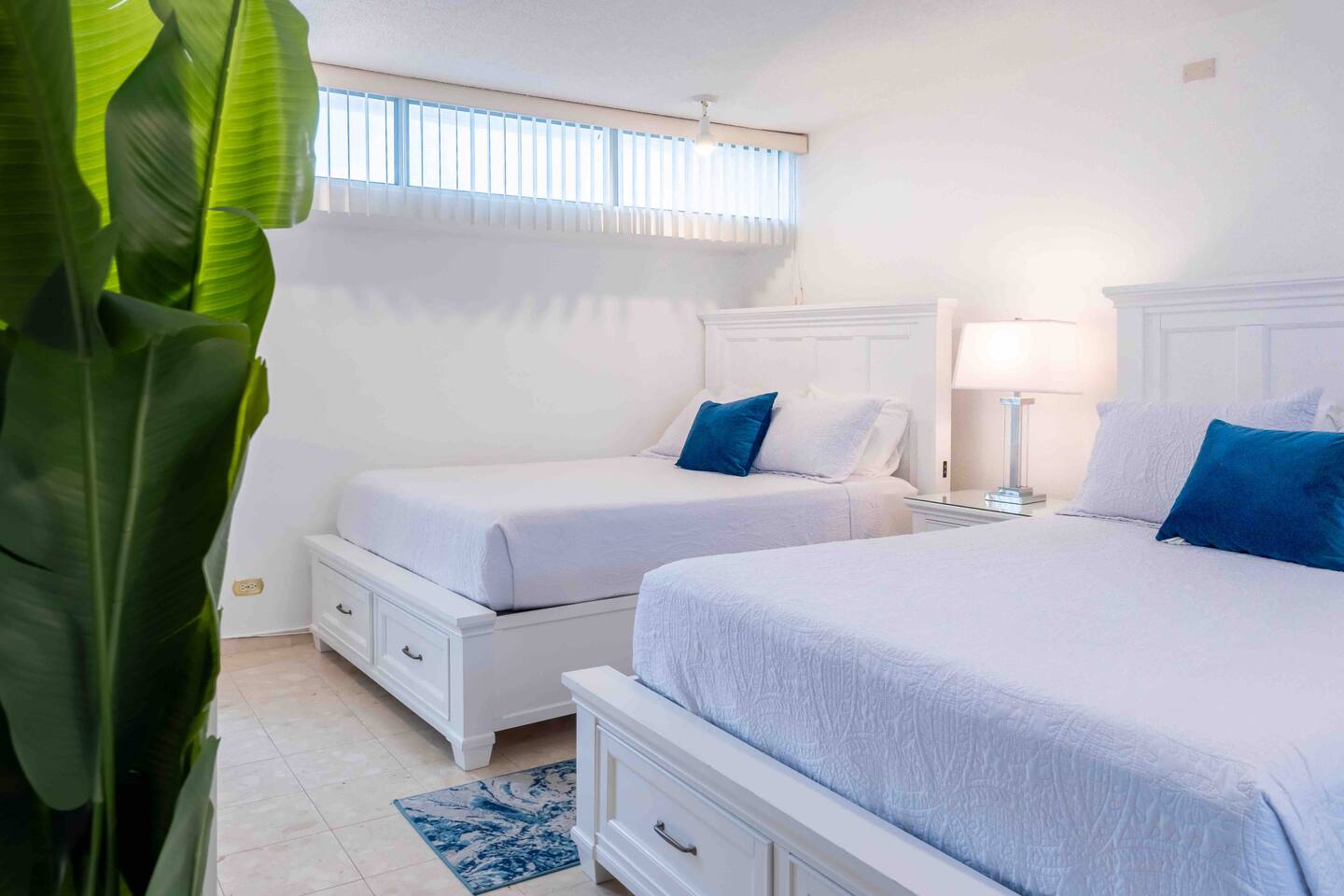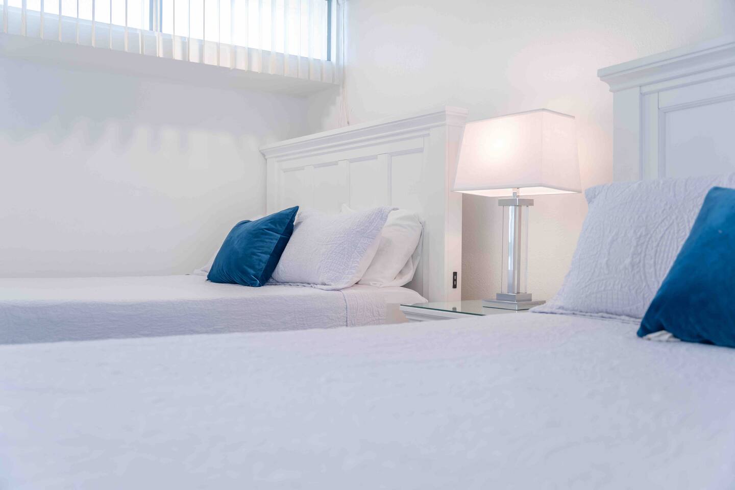 ❖️ BEDROOM ARRANGEMENTS ❖  As the sun dips below the horizon and the final moves of board games are played, it's time to retreat to your cozy bedrooms. In the first bedroom, a grand king-sized bed beckons, accompanied by a dedicated workspace and your very own HDTV perfectly positioned for bedtime viewing. This splendid bedroom is your haven of comfort, with soft linens and plump pillows ready to cocoon you into a restful slumber night after night. The master bedroom carries the same beachy charm, boasting an ensuite bathroom for your convenience. After a revitalizing shower in the walk-in, prepare for the night ahead at the spacious sink vanity, feeling the soothing coastal vibes. Now, onto the second bedroom, where two queen-sized beds await. This room is a breath of fresh air, with ample natural light and a bedside lamp casting a gentle glow for those moments of evening wind-down. The greenery of plants in this room adds to the tranquil atmosphere, promising a peaceful night's sleep after a day in the sun at the beach. Bedroom number three echoes the layout of the second, offering another pair of queen-sized beds for a comfortable and restful night's sleep. The high window floods the room with natural light, creating an inviting and bright ambiance. In each bedroom, you'll find your own HDTV, allowing you to bring your evening entertainment straight to the comfort of your bed. So, put on your favorite movies and drift into a state of pure bliss as you settle into the perfect end to your day. ♛ Bedroom 1: King Sized Bed, Ensuite Bathroom, HDTV