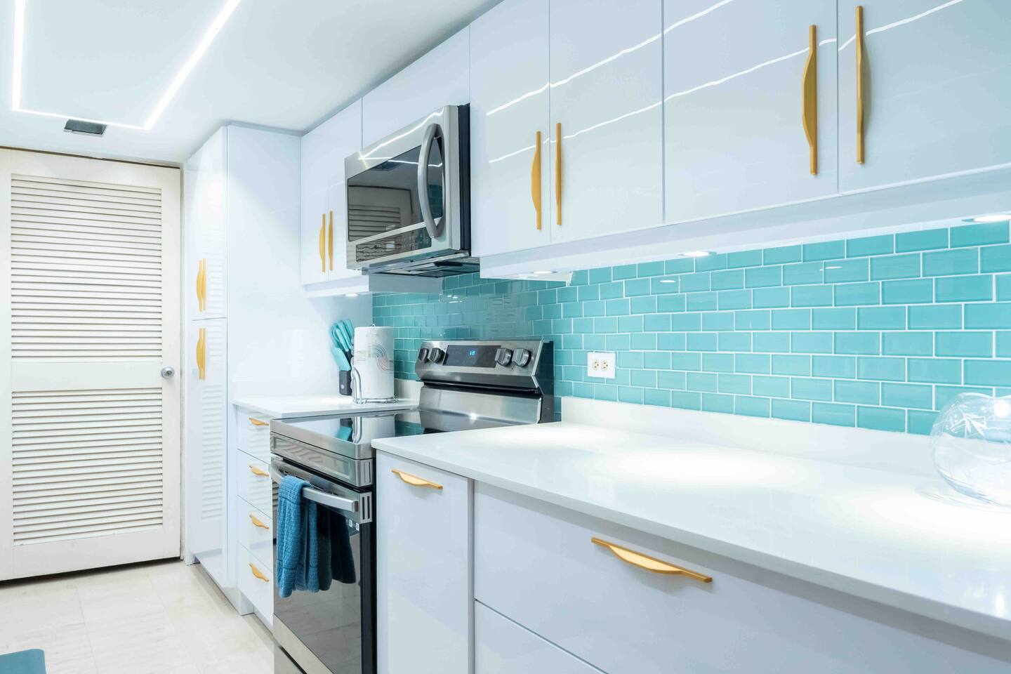 When hunger calls, step into our chic kitchen area, where stunning blue tiles dance in contrast with light-hued cabinets adorned with elegant gold accents. It's a place where cooking becomes an art form, and aesthetics meet culinary flair, perfect for crafting a three-course gourmet masterpiece. Equipped with all the essentials, you'll find a range of appliances at your fingertips, from the dependable stove and oven to the trusty microwave, freezer, and refrigerator. For the coffee aficionados among you, there's also a coffee maker to brew your favorite morning elixir. The spacious countertops offer ample room to spread out your ingredients and kitchen tools, ensuring a well-organized cooking experience. Once your culinary creations are complete, gather around the inviting square dining table, which accommodates up to 8 diners. It's the ideal setting to share your delectable dishes with family and friends, transforming your meals into memorable gatherings. ✔ Microwave