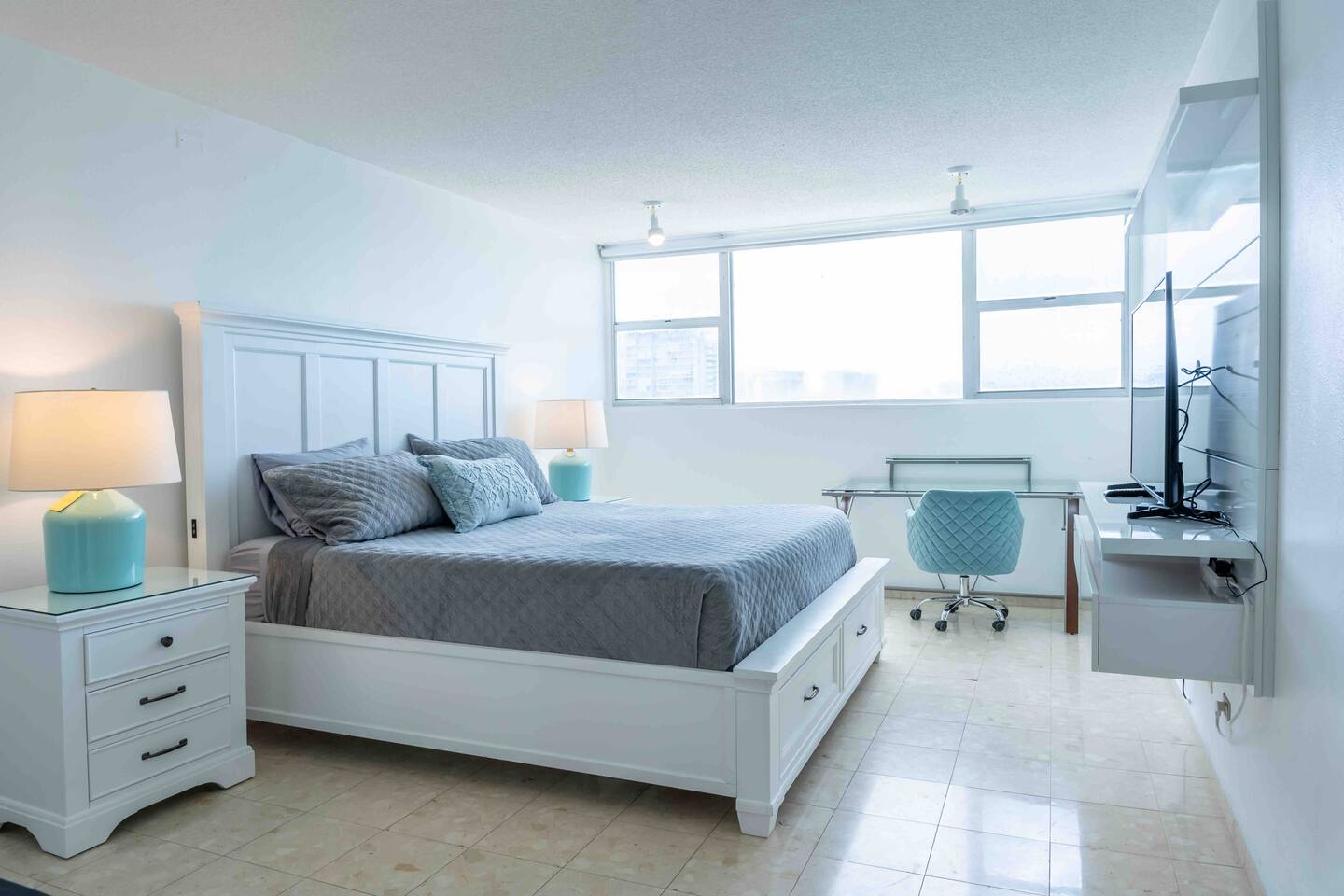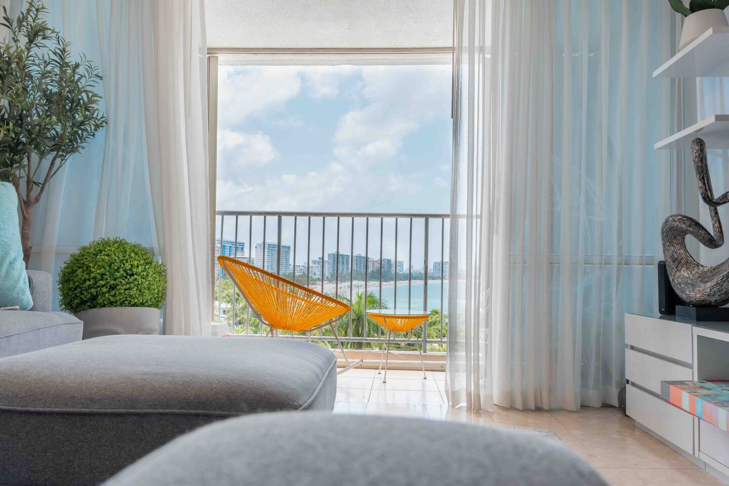 We want to inform you that the pool is temporarly close and for that reason the rate was adjusted. Welcome to your coastal sanctuary where beauty and comfort intertwine seamlessly. Inside, the interior is a haven of style, bathed in natural light that pours through the glass sliding doors. Your private balcony, adorned with outdoor furniture, serves as your personal gateway to breathtaking ocean and beach views. As you step into the shared game room, the allure of arcade games and a pool table beckons, promising endless moments of enjoyment. And for those who seek an active retreat, the shared gym is fully equipped, ensuring you can maintain your fitness regime while basking in the spaciousness of your retreat. The kitchen is a culinary dream, with stylish blue tiling, light-colored cabinets, and gold accents creating an aesthetic backdrop for your gourmet creations. As the day winds down, the bedrooms, complete with king and queen-sized beds, offer a cozy sanctuary for restful nights. Now, let's explore the prime location of your haven. Nestled in the heart of Isla Verde, you're just a short stroll away from sun-kissed beaches that beckon with their sandy shores and sparkling waters. A mere 15 minutes by car, Old San Juan invites you to explore its historic streets, colorful buildings, and vibrant culture. And for those seeking a taste of adventure, the famous El Yunque National Forest is a scenic 35-minute drive away, where you can immerse yourself in lush rainforest beauty. With a location that offers both relaxation and exploration, your retreat ensures the perfect balance for an unforgettable getaway. ✔ 1 King & 4 Queen Beds ✔ Private Balcony