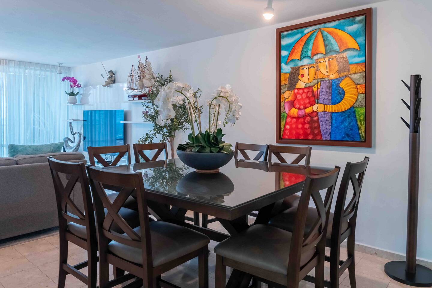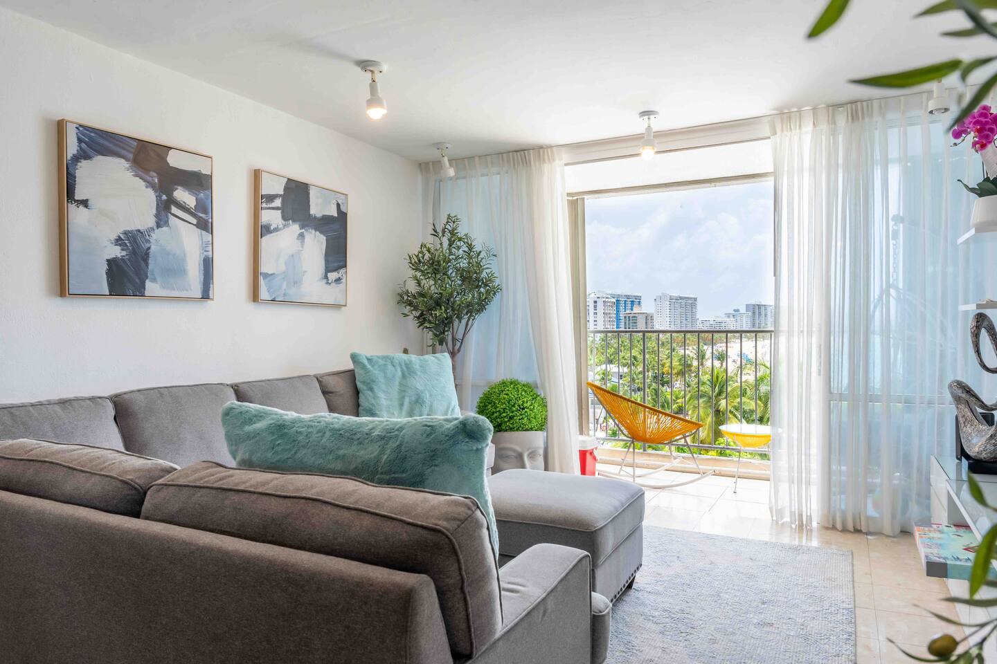 As you step into the living room, you'll be enveloped by coastal-themed decorations that set a relaxed and inviting tone. Sink into the embrace of the beautiful L-shaped sofa, where you can unwind while gazing at the 65” OLED TV. It's fully equipped with streaming services like Netflix, Hulu, HBO GO, and more, offering the perfect entertainment for your evenings. This cozy space is adorned with decor that instantly makes you feel at home. Natural light pours in through the expansive glass sliding doors, casting a warm and welcoming glow throughout the room. These doors provide direct access to your private balcony, complete with outdoor furniture, inviting you to soak in the stunning beach and ocean vistas. Inside, an abundance of flowers and greenery brings the beauty of the natural surroundings indoors, infusing the living room with comfort and tranquility. In addition to the OLED 65” HDTV, you'll find a collection of board games tucked just below, ready for you to embark on a friendly competition. It's the ideal way to cap off a day filled with exploration and adventure, ensuring memorable nights in your coastal haven.